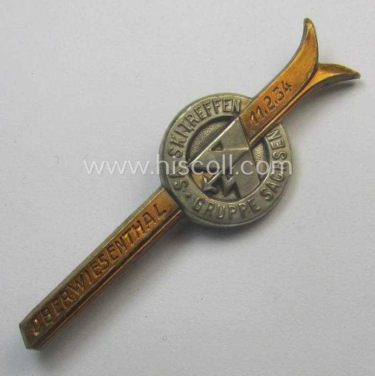 Commemorative, silverish- (ie. golden-orange-) coloured 'SA- o. Sturmabteilungen'-related 'tinnie' being a non-maker-marked example showing a pair of ski's, SA-logo- and text: 'SA-Skitreffen - Gruppe Sachsen - Oberwiesenthal - 11.2.1934'