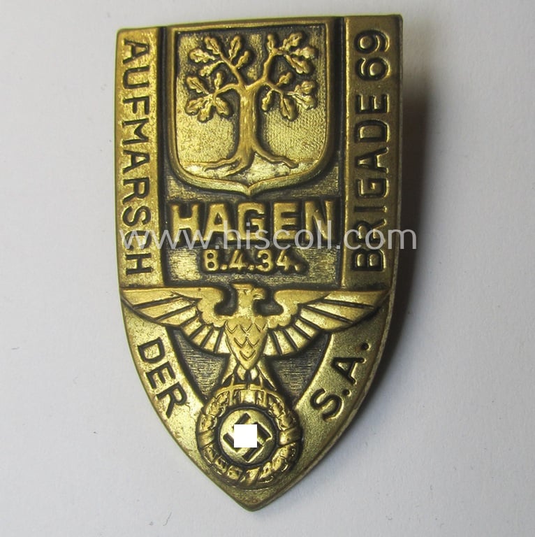 Commemorative - and fairly early-period! - golden-bronze-toned SA- (ie. 'Sturmabteilungen'-) related 'tinnie' entitled: 'Aufmarsch der S.A.-Brigade 69 -Hagen - 8.4.34'