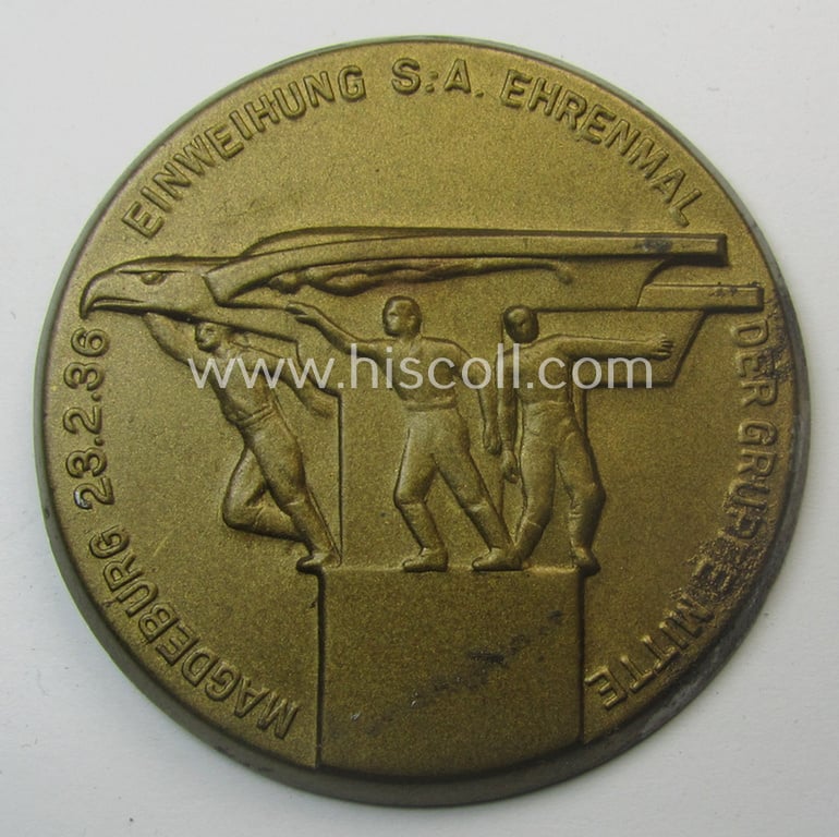 Commemorative, SA- (ie. 'Sturmabteilungen'-) related 'tinnie' being a non-maker-marked example showing three sportsmen and eagle-statue coupled with the text: 'Einweihung S.A.-Ehrenmal der Gruppe Mitte - Magdeburg - 23.2.1936'