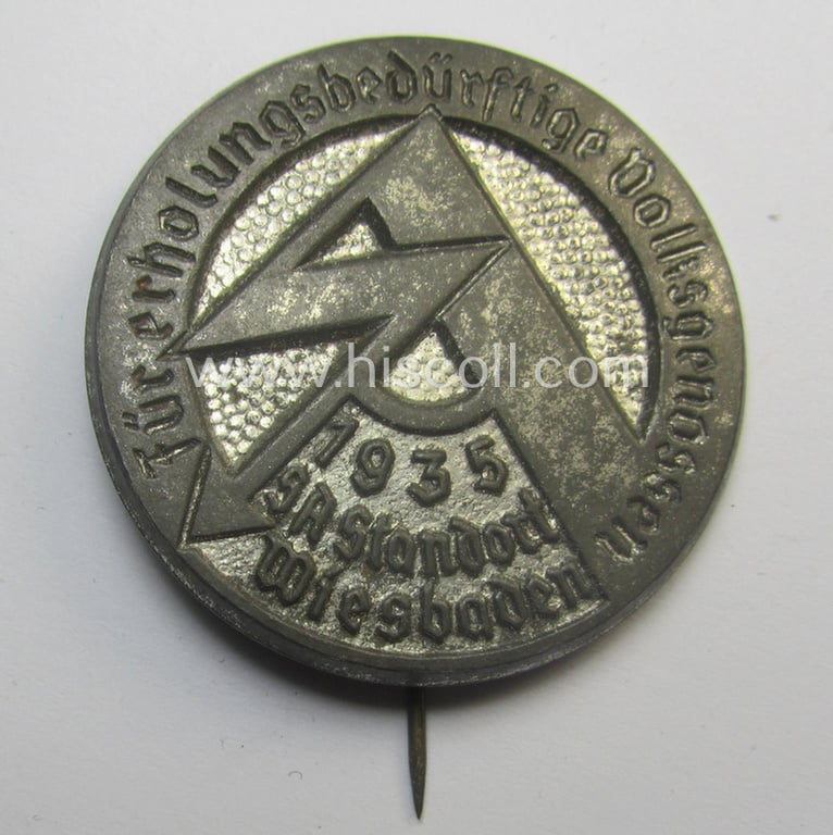 Commemorative - and fairly early-period! - greyish-silver-toned SA- (ie. 'Sturmabteilungen'-) related 'tinnie' entitled: 'Für erhohlungsbedürftige Volksgenossen - SA-Standarte Wiesbaden - 1935'
