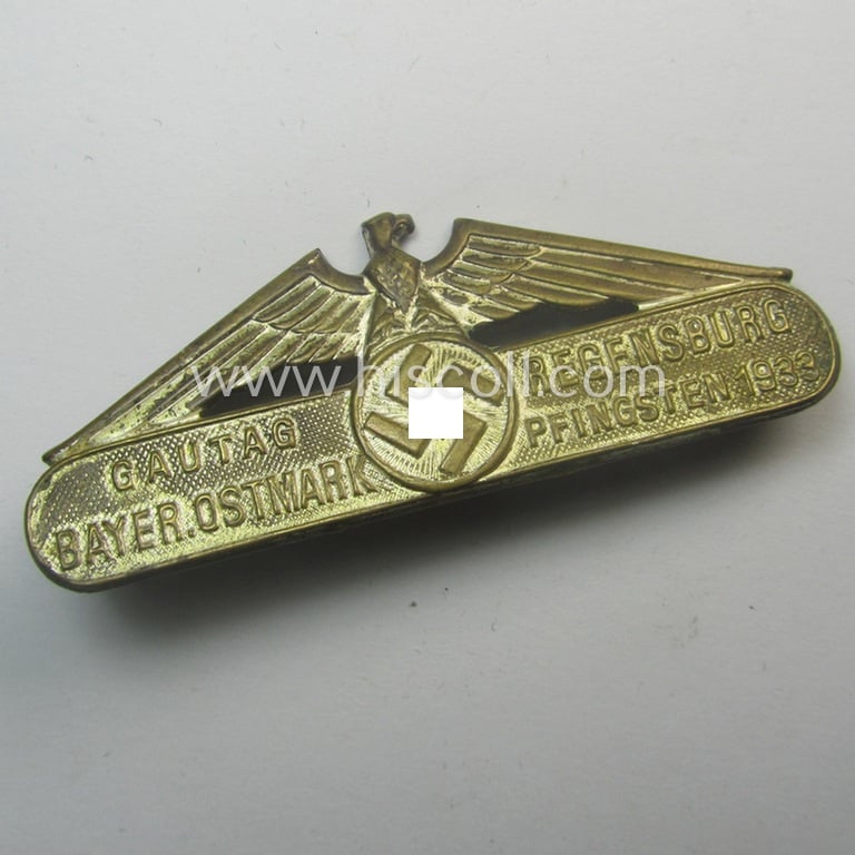 Silver-toned, N.S.D.A.P.-related day-badge (ie. 'tinnie') being a non-maker-marked example as was issued to commemorate a specific meeting entitled: 'Gautag Regensburg - Bayer. Ostmark - Pfingsten 1933'