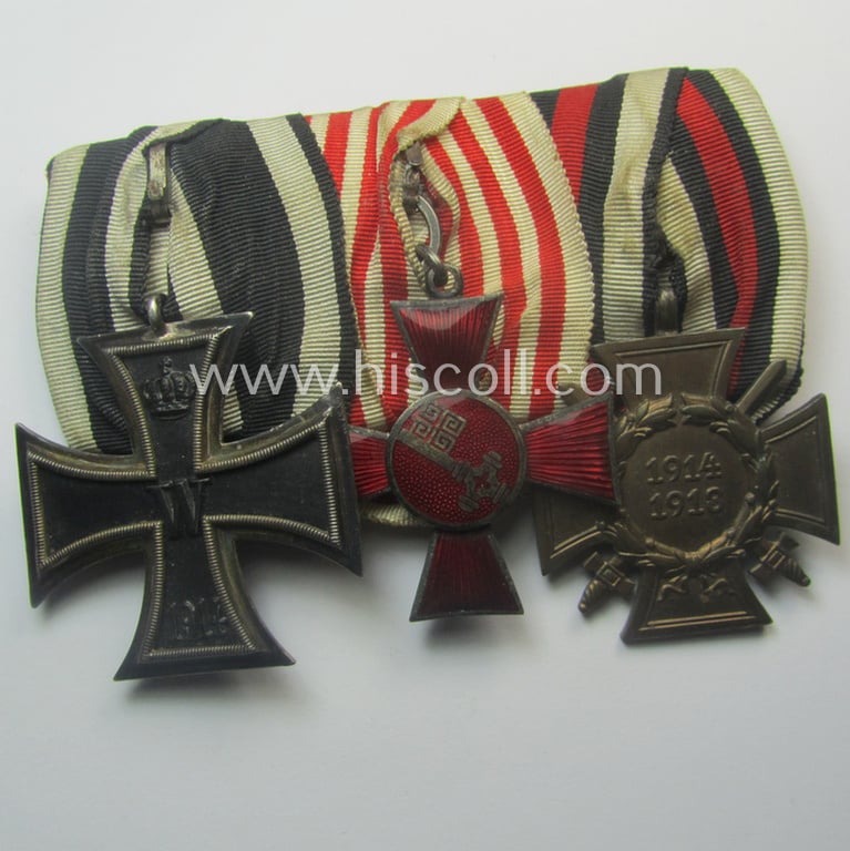 Three-pieced, 'WWI'-related medal-bar (ie. 'Ordenspange') resp. depicting a WWI-period: 'EK II.Kl.', a neatly enamelled 'Hanseatenkreuz Bremen' and a: 'FKK 1914-18 mit Schwn.'