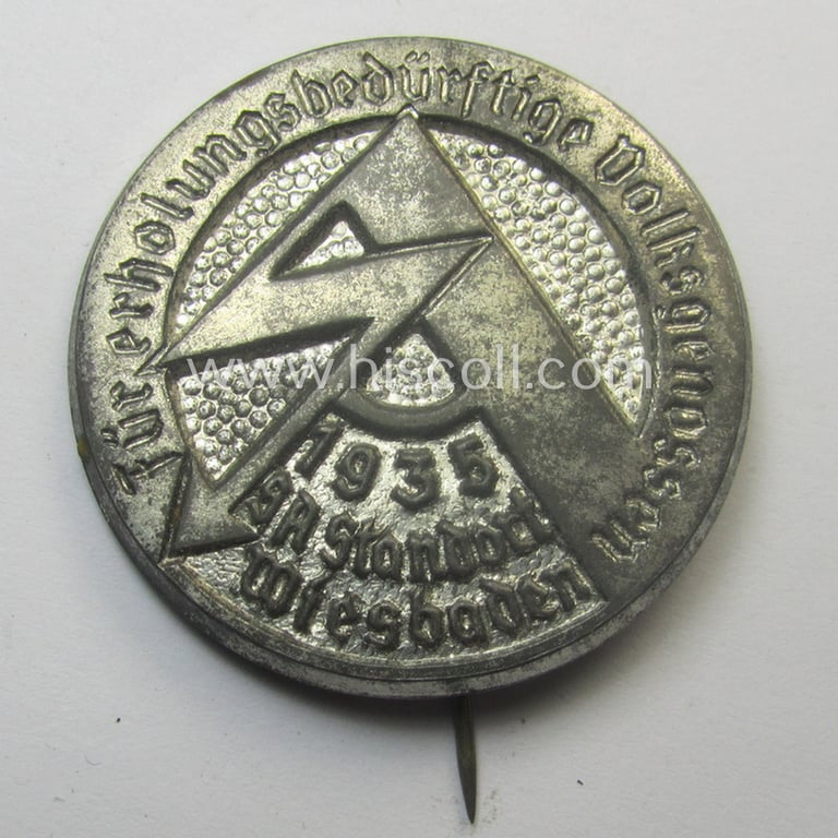 Commemorative - and fairly early-period! - greyish-silver-toned SA- (ie. 'Sturmabteilungen'-) related 'tinnie' entitled: 'Für erhohlungsbedürftige Volksgenossen - SA-Standarte Wiesbaden - 1935'
