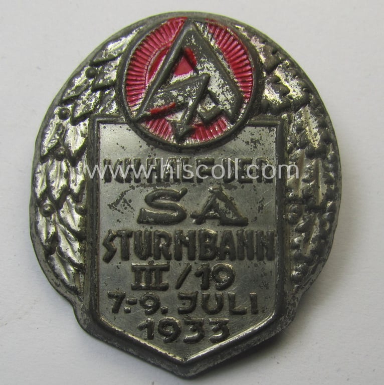 Commemorative - rarely found and early-period! - greyish-silver- (and red-) toned SA- (ie. 'Sturmabteilungen'-) related 'tinnie' entitled: 'Ich half der S.A.Sturmbann III/10 - 7.-9. Juli 1933'