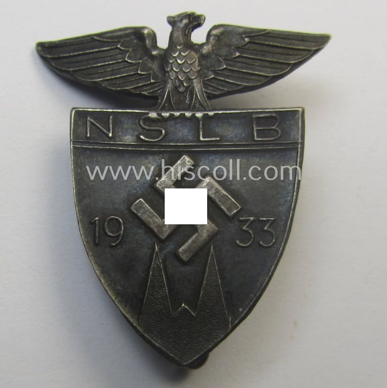 This is a truly attractive - rarely encountered and very detailed! - 'high-quality'-produced example of a: so-called: 'Ehrenzeichen des Nationalsozialistische Lehrerbund 1933' (or: NSLB) being a genuine-silver-based ie. '800'-marked example that comes in an overall very nice- (albeit moderately used- and/or most certainly worn-), condition. This (tiny) lapel-pin was intended for loyal members of the 'Nationalsozialistische Lehrerbund' (or: NSLB) which can be translated as the: National-Socialist Teachers League. The NSLB was established on April 21, 1929 and lasted until 1943. The lapel-pin is constructed of genuine silver-based material and is clearly '800'-stamped on its back (as can be noticed on the pictures). The obverse features a typical 'Reichadler'-device perched above a shield which reads: 'NSLB' to the top has a central mobile swastika flanked by the years-designation: '1933' and an illustration of a three-steeple building to its bottom. The fullback reverse is marked: '800' (silver content-designation) and has a vertically soldered-on round plate that is marked: 'Ges. Gesch.' that holds a functional pin-/ie. pin-catch-assembly. The overall detail on this 'NSLB'-related lapel-pin is very nice and pronounced: the silver-finish shows some minimal wear and/or age as stated above: this is simply caused by normal usage. Simply a very attractive - and actually rarely encountered! - 'NSLB'-related 'Ehrenzeichen 1933' that is most certainly accordingly priced!