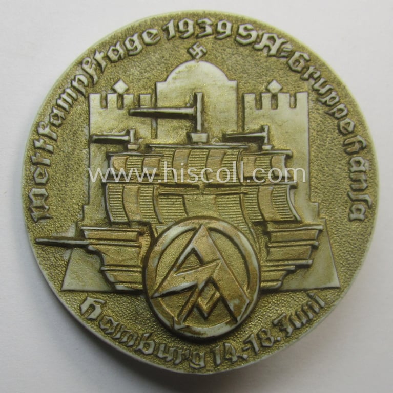 Commemorative, beige-coloured 'SA'-related 'tinnie' being a maker- (ie. 'R. Sieper & Söhne'-) marked example depicting a merchant-ship and 'SA'-logo and text: 'Wettkampftage 1939 - SA-Gruppe Hansa - Hamburg - 14.-18. Juni'