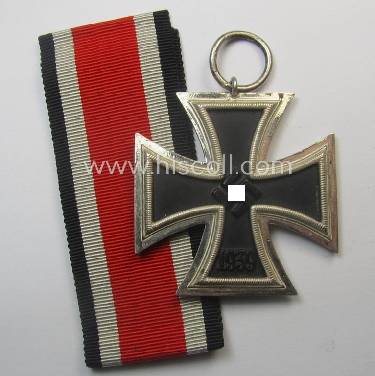 'EK II. Klasse' being a maker- (ie. '13'-) marked example that comes together with its original- and never-mounted ribbon (ie. 'Bandabschnitt') as was produced by the maker (ie. 'Hersteller'): 'Gustav Brehmer'