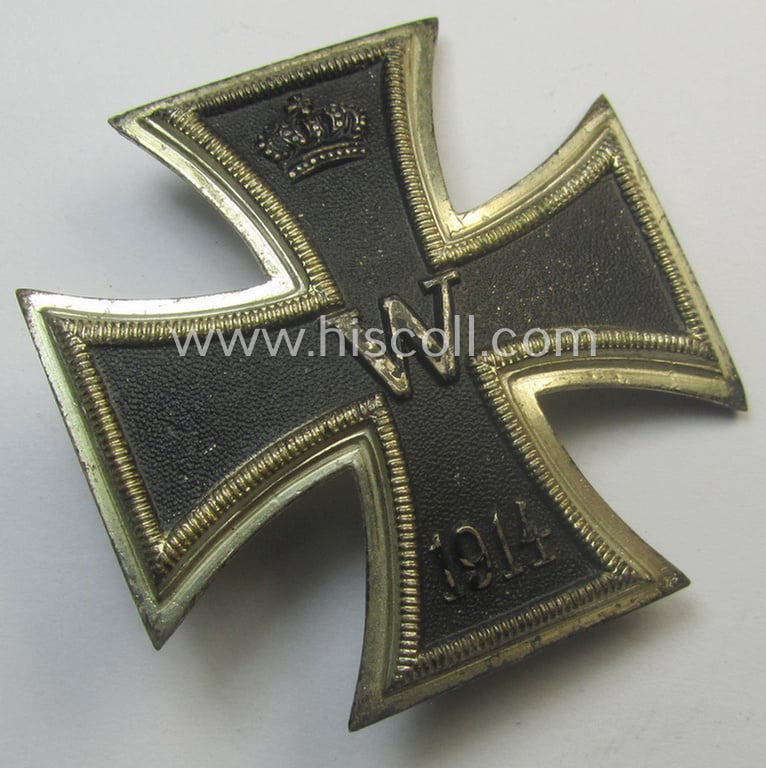 The very attractive cross - which is a typical quite-vaulted (ie. truly converse!) shaped example as is more often encountered - has - I deem - never been cleaned and retains a very nice- (albeit minimally tarnished) age-patina and/or great pronounced detail. This WWI-period example - which is a magnetic example as more often seen - comes mounted onto its original (and naturally fully functional) (typical!) flute-like-shaped pin and has a totally unaltered (and also functional) catch (as can be seen on the pictures). The cross - which shows a nicely preserved, 'blackened'- and/or fairly 'satin-like'- ie. somewhat 'matted'-like 'inner-core' - shows some minimal age but is totally void of any real damage: it retains a very nice appearance overall. The piece is as stated above totally void of a makers'-designation but is by all means a typical example that was produced by the (desirable and scarcely observed!) maker (ie. Hersteller) named: 'Petz & Lorenz' (various details such as the 'dotted-styled inner-core' and/or typical pin- ie. pin/catch-set-up only confirm this as can be seen on the pictures). The cross is, moreover, just a bit dirty and tarnished simply caused by years of storage and/or moderate wear but retains a great unmessed-with and/or uncleaned, age-patina. Simply an attractive IC-first-class by an unusally seen maker that was never before part of a collection: I deem that I have priced this attractive WWI-period example, accordingly!
