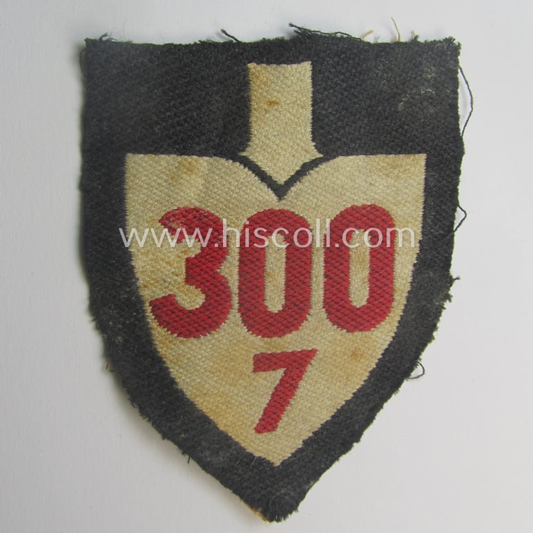 Truly used, EM- (ie. NCO-) pattern, so-called: RAD (ie. 'Reichsarbeitsdienst') sleeve-badge (or: 'Dienststellenabzeichen') bearing the specialist- ie. unit designation: '300/7'