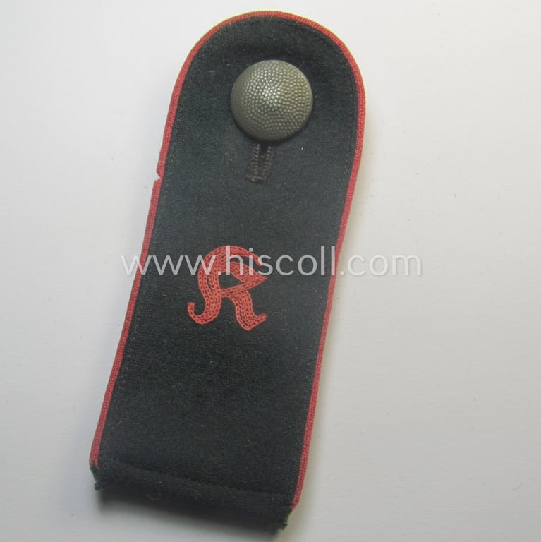This is a truly attractive - very desirable albeit regrettably single but nevertheless exceedingly rarely found! - example of an early-period (ie. 'M40-pattern and/or rounded-styled and bright-pink- ie. 'rosaroter'-piped), WH (Heeres) 'cyphered', enlisted-mens'-type shoulderstrap as was specifically intended for usage by a: 'Soldat eines Kradschützen-Bataillons der Pz.- u. Inf.-Div.' (or: simple soldier who served within a specific reconnaissance, motorcycle-battalion) and that comes in an overall very nice- (ie. just moderately used- ie. worn-), condition. The neat strap - which is executed in the darker-green-coloured wool as to be expected - shows the bright-pink- ie. 'rosaroter'-coloured and woolen-type piping. The neat strap measures approximately 11 cms. in length and comes naturally mounted onto its original tongue. It shows the neat (machine-embroidered by means of so-called: 'Kurbelstickerei'), Gothic-styled: 'K'-cypher (or: 'Ziffer') and shows a removed numeral as per regulation. The 'K'-cypher is executed in the bright-pink- ie. 'rosatoter'-coloured wool ie. linnen as to be expected. The strap - which is of the typical 'standard-issued'-pattern - shows as stated above moderate usage and wear (just some minimal age, dust and/or staining is visible and/or present). It should be noted that ALL 'cyphered', enlisted-mens'-pattern, 'Kradschützen-Bataillonen'-type shoulderstraps can easily be regarded 'exceedingly rare' and come not that often for sale. This particular example originated from a small but wonderful collection of rare 'Panzer'-related shoulderstraps I recently acquired for the web-site. In any case is this a very attractive and early-war-period, 'Heeres-'Kradschützen-Bataillonen'-related, EM-type shoulderstrap that was intended for usage by a: 'Soldat eines Kradschützen-Bataillons der Pz.- u. Inf.-Div.': too bad that it is only a single specimen!