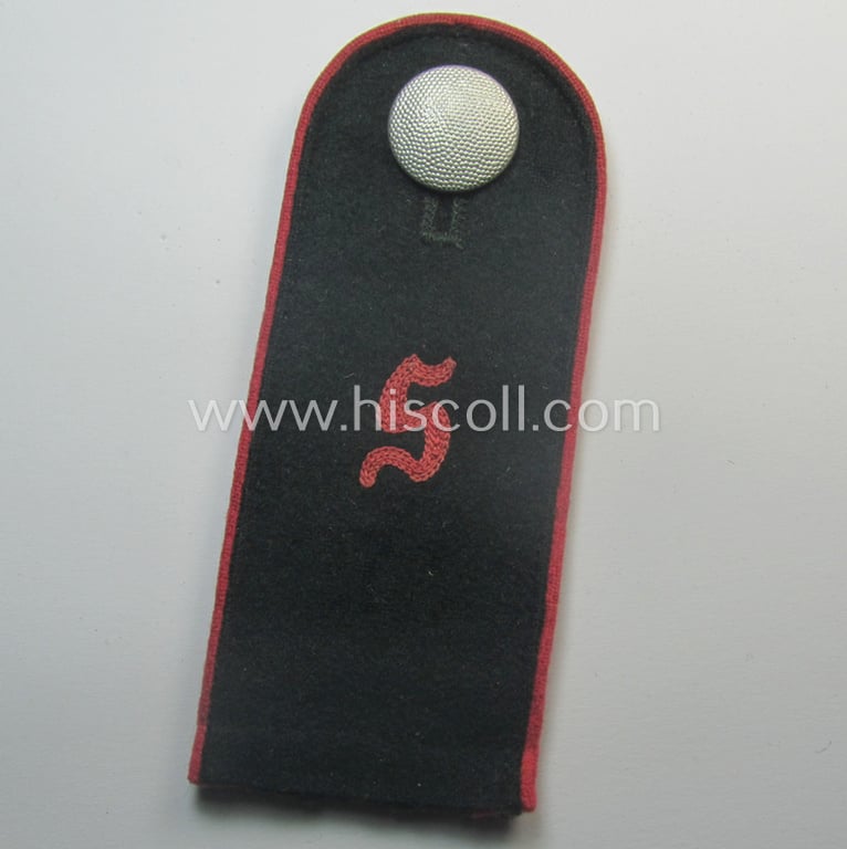 This is a truly attractive - very desirable albeit regrettably single but nevertheless rarely found! - example of an early-period (ie. 'M40-pattern and/or rounded-styled and bright-pink- ie. 'rosaroter'-piped), WH (Heeres) 'cyphered', enlisted-mens'-type shoulderstrap as was specifically intended for usage by a: 'Soldat eines Panzer-Schützen-Regiments' (or: simple soldier who served within a specific anti-tank regiment) and that comes in an overall very nice- (ie. just moderately used- ie. worn-), condition. The neat strap - which is executed in the darker-green-coloured wool as to be expected - shows the bright-pink- ie. 'rosaroter'-coloured and woolen-type piping. The neat strap measures approximately 11,5 cms. in length and comes without tongue: it was carefully cut-off a tunic. It shows the neat (machine-embroidered by means of so-called: 'Kurbelstickerei'), Gothic-styled: 'S'-cypher (or: 'Ziffer') and shows a removed numeral as per regulation. The 'S'-cypher is executed in the bright-pink- ie. 'rosatoter'-coloured wool ie. linnen as to be expected. The strap - which is of the typical 'standard-issued'-pattern and that came with a standard (silver-toned) tunic-button as found - shows as stated above moderate usage and wear (just some minimal age, dust and/or staining is visible and/or present). It should be noted that ALL 'cyphered', enlisted-mens'-pattern, 'Panzer-Schützen'-type shoulderstraps can easily be regarded 'rare' and come not that often for sale. This particular example originated from a small but wonderful collection of rare 'Panzer'-related shoulderstraps I recently acquired for the web-site. In any case is this a very attractive and early-war-period, 'Heeres-Panzerschützen'-related, EM-type shoulderstrap that was intended for usage by a: 'Soldat eines Panzer-Schützen-Regiments': too bad that it is only a single specimen!