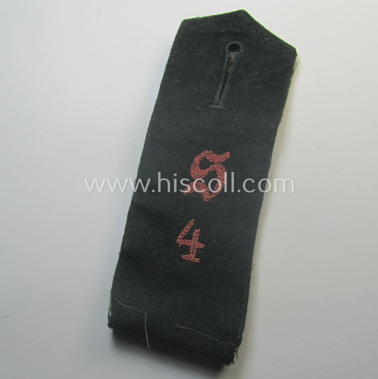 This is a truly attractive - very desirable albeit regrettably single but nevertheless rarely found! - example of an early-period (ie. 'M36-pattern and/or pointed-styled and as per regulation non-piped) WH (Heeres) 'cyphered', enlisted-mens'-type shoulderstrap as was specifically intended for usage by a: 'Soldat des Panzer-Schützen-Regiments 4' (or: simple soldier who served within a specific anti-tank regiment numbered: '4' ) and that comes in an overall very nice- (ie. just moderately used- ie. worn-), condition. The neat strap - which is executed in the darker-green-coloured wool as to be expected - measures approximately 12,4 cms. in length and comes mounted onto its period tongue. It shows the neat (machine-embroidered by means of so-called: 'Kurbelstickerei'), Gothic-styled: 'S'-cypher (or: 'Ziffer') and/or '4'-numeral which are both executed in the bright-pink- ie. 'rosatoter'-coloured wool ie. linnen as to be expected. The strap - which is of the typical 'standard-issued'-pattern shows as stated above just moderate usage and wear (just some minimal age, dust and/or staining is visible and/or present). It should be noted that ALL 'cyphered', enlisted-mens'-pattern, 'Panzer-Schützen'-type shoulderstraps can easily be regarded 'rare' and come not that often for sale. This particular example originated from a small but wonderful collection of rare 'Panzer'-related shoulderstraps I recently acquired for the web-site. In any case is this a very attractive and early-war-period, 'Heeres-Panzerschützen'-related, EM-type shoulderstrap that was intended for usage by a: 'Soldat des Panzer-Schützen-Regiments 4': too bad that it is only a single specimen!