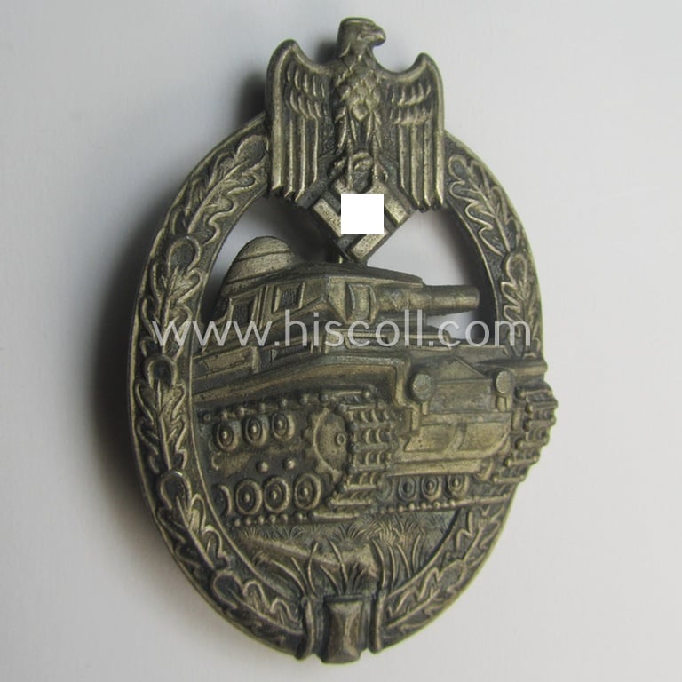 This is an attractive - and clearly issued- and/or just moderately worn! - example of a so-called: 'Panzerkampfabzeichen in Silber' (or: silver-class panzer-assault badge or PAB) being a clearly maker- (ie. 'AS' in a triangle-) marked- and/or typical zinc- (ie. 'Feinzink'-) based specimen as was procuced by a to date unknown maker and that comes in an overall nice- (and I deem moderately used- and/or worn-), condition. The badge on offer here concerns (I deem) a mid-war-period-, zinc- (ie. 'Feinzink'-) based specimen that retains most of its sprayed silver-coloured finish but that has tarnished over the years: nevertheless, does it still have an attractive appearance, still showing pronounced detail as to be expected by a badge by this particular maker. The badge - which has a typical, somewhat greyish zinc-type age-patina - has, however, I deem never been cleaned nor polished (and is still a tiny bit dirty ie. stained- ie. tarnished as mentioned above). As stated is the piece a neatly maker-marked example that shows the various characteristics - such as for example the typically ball-shaped pin-set-up, silver-coloured- and thin-shaped pin and/or modelled catch - as only seen on PABs as produced by this (still unidentified) maker: it deals with a so-called: 'AS in Triangle Die 2'-pattern (as is uniquely numbered with the reference-number: '3.3.2.' according to the excellent reference-work entitled: 'The Panzer-Assault badge of WWII' by my Belgian friend Philippe de Bock). This piece naturally shows all the details as to be expected for a badge by this particular maker. The piece was recently found as such at a German private-household and was never before part of a collection. Simply an attractive and honest silver-class PAB by this still unidentified maker that is with certainty accordingly priced!