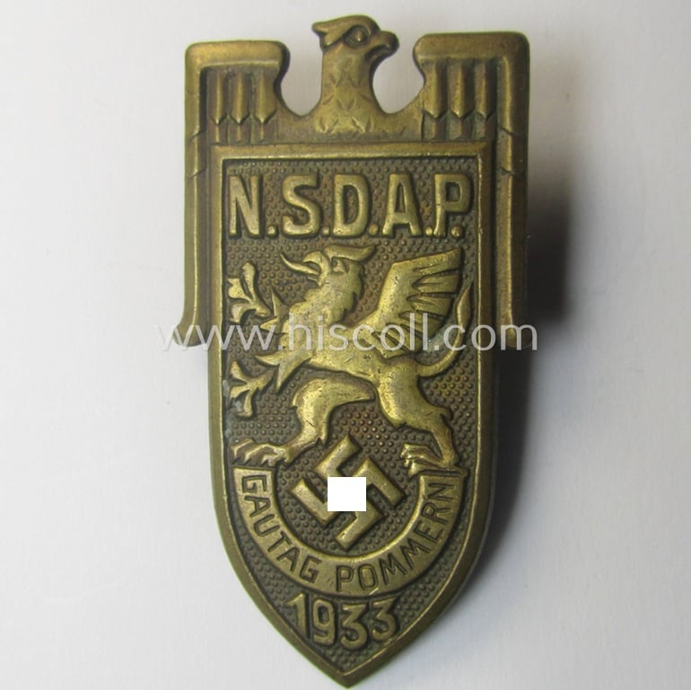 Commemorative - and luxuriously styled! - bright-golden-coloured, N.S.D.A.P.-related 'tinnie' being a maker- (ie. 'Walter Demmer'-) marked example depicting an illustration of an eagle and bearing the text: 'N.S.D.A.P. Gautag - Pommern - 1933'