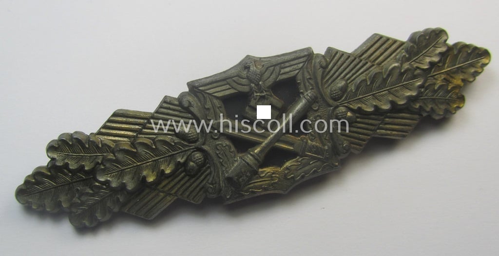 This is a very attractive - and I deem just minimally used- and/or worn! - example of a so-called: 'Nahkampfspange in Bronze' (or bronze-class close-combat clasp ie. CCC) being a neatly maker- (ie. 'F.&B.-L.'-) marked- and/or minimally converse-shaped version (by the desirable maker- ie. 'Hersteller': 'Funcke u. Brüninghaus') and that comes in an overall very nice- (and I deem only minimally used ie. worn-), condition. The piece - which has a very detailed and/or pronounced appearance - is as stated a neatly maker-marked version bearing the (as always 'upside-down-positioned'!) makers'-designation- (ie. logo: 'F.&B.-L.') on its back denoting that this is a piece as was produced by the: 'Funcke u. Brüninghaus'-company based in the town of Lüdenscheid. The 'Spange' is as stated a minimally converse-shaped example that comes mounted onto its (fully functional- and typical bronze-coloured) flute-shaped pin (and/or typical 'flat-wire'-type catch- ie. catch-set-up) both which are of course still present, unaltered and/or fully functional. The clasp truly retains almost all of its original golden-bronze-toned finish whereas the 'crimped' (and still neatly black-coloured) metal-based 'back-plate' is naturally also present and firmly in place (as can be noticed on the pictures). A similar example is also described in the excellent reference-book entitled: 'The German Close Combat Clasp of World War II' by my friend Thomas M. Durante wherein this particular pattern is given the unique reference-numeral : '3.2. - F &BL - “2nd Pattern“ - Flatwire Catch'. The piece was found as such at a private-household in Germany and was never before part of a collection. Simply a very attractive and hardly used example of a bronze-class 'Nahkampfspange' by 'F.&B.-L.': it should be noted that original examples of this neat combat-award are nowadays getting hard to find. I deem that I priced this example according to its overall very nice and/or fully untouched, condition!