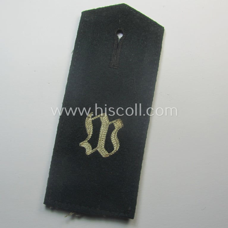 This is a very attractive - albeit regrettably single but nevertheless exceedingly rarely found! - example of an early-period (ie. 'M36- o. M40'-pattern and/or typically 'pointed'-styled) WH (Heeres) neatly 'cyphered' (and/or per regulation non-piped ie. generic-styled!) enlisted-mens'-type shoulderstrap as was intended for usage by a: 'Soldat des Wachbatallions Berlin' (or: private and/or infantry-soldier who served within the famous guard-batallion based in the town Berlin) and that comes in an overall very nice- (ie. just moderately used- ie. worn-), condition. The neat strap - which is executed in the darker-green-coloured wool - is naturally void of any piping (as can be seen on the pictures). The strap measures approximately 12 cms. in length and comes without tongue attached: it was carefully cut-off a tunic (as can be noticed on the picturs). The neat strap shows the typical Gothic-styled, capital: 'W'-cypher (ie. 'Ziffer') which is neatly machine-embroidered by means of so-called: 'Kurbelstickerei' (as can be seen on the pictures). The 'cypher' is executed in the white- (ie. 'weisser'-) coloured coloured wool ie. linnen as to be expected (as can be seen on the pictures). The strap shows as stated above only moderate usage and wear (just some minimal age, dust and/or staining is visible and/or present). It should be noted that ALL 'cyphered', EM-pattern, 'Wachbataillon'-type shoulderstraps can easily be regarded 'veryrare'. In any case a very attractive and/or: early-war-period, 'Wachbataillon'-related, EM-type shoulderstrap that was intended for usage by 'Soldat des Wachbatallions Berlin': too bad that it is only a single specimen!