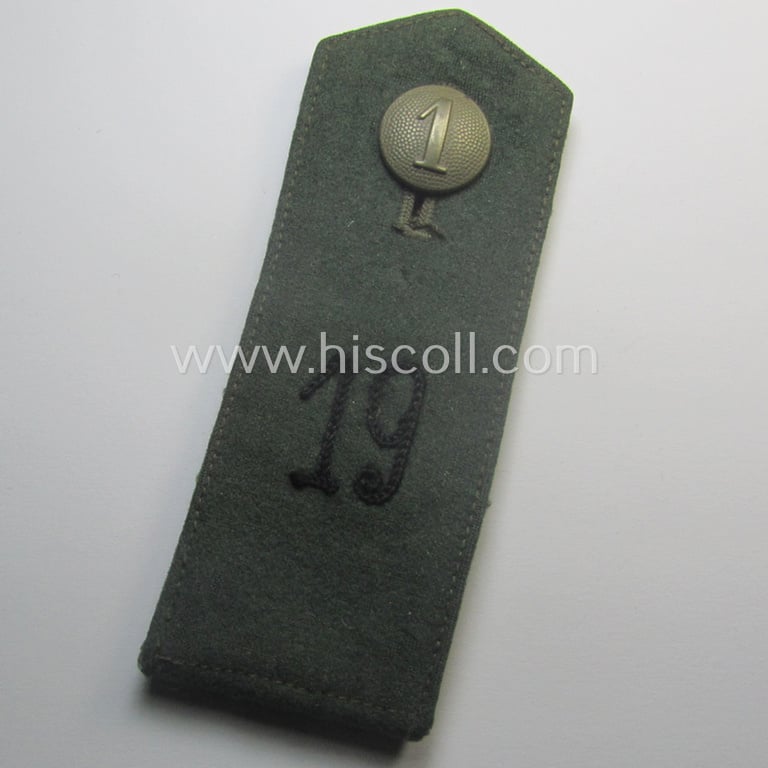 This is an attractive - albeit regrettably single! - WH (Heeres), early- (ie. pre-war-) period, so-called: 'M36'-pattern- (pointed-styled- and neatly 'cyphered'- and/or per regulation non-piped) enlisted-mens'-type shoulderstrap as was specifically intended for - and worn by! - a: 'Soldat des Pionier-Regiments 19' (or: simple soldier who served within the army enigineers-unit ie. regiment numbered: '19') and that comes in an overall nice- (albeit just moderately used ie. worn-), condition. The shoulderstrap - which is approximately 12,5 cms. sized in length - has the 'standard-type'- and/or darker-green-coloured, smooth-woolen-based 'upperdeck' and has (of course) no piping attached. The strap shows the neat (machine-embroidered by means of so-called: 'Kurbelstickerei'-) so-called: '1'- and '9'-cyphers ie. numerals (which 'cyphers' are executed in the black- (ie. 'schwarzer'-) coloured wool ie. linnen as to be expected as can be seen on the pictures). The strap - which comes mounted onto its functional tongue - shows as stated above only moderate usage and/or wear and is just minimally stained: moreover, does it show a (field-grey-coloured) tunic- ie. company-button, numbered: '1' (as can be noticed on the pictures). It should be noted that all 'cyphered'-pattern shoulderstraps can easily be regarded 'fairly scarce'. Simply an attractive and/or: early- (ie. pre-) war-period, neatly 'cyphered' and/or 'Heeres'-related EM-type shoulderstrap that was intended for usage by a: 'Soldat des Pionier-Regiments 19'!
