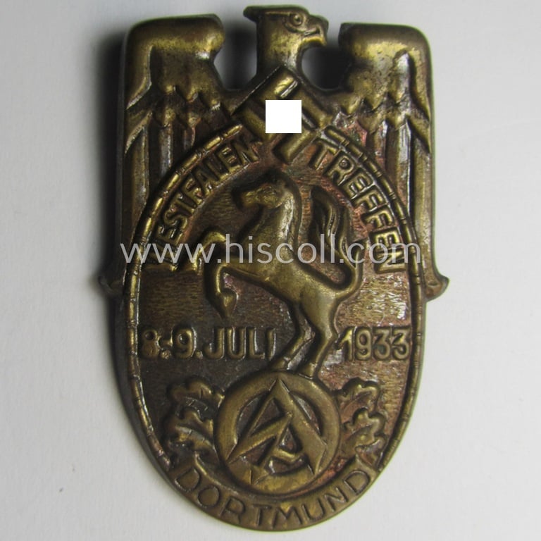 Commemorative, golden-bronze-coloured N.S.D.A.P.- (ie. 'SA- o. Sturmabteilungen'-) related 'tinnie' being a non-maker-marked example showing a detailed eagle-device, SA-logo- and text: 'Westfalentreffen - Dortmund - 8.9. Juli 1933'