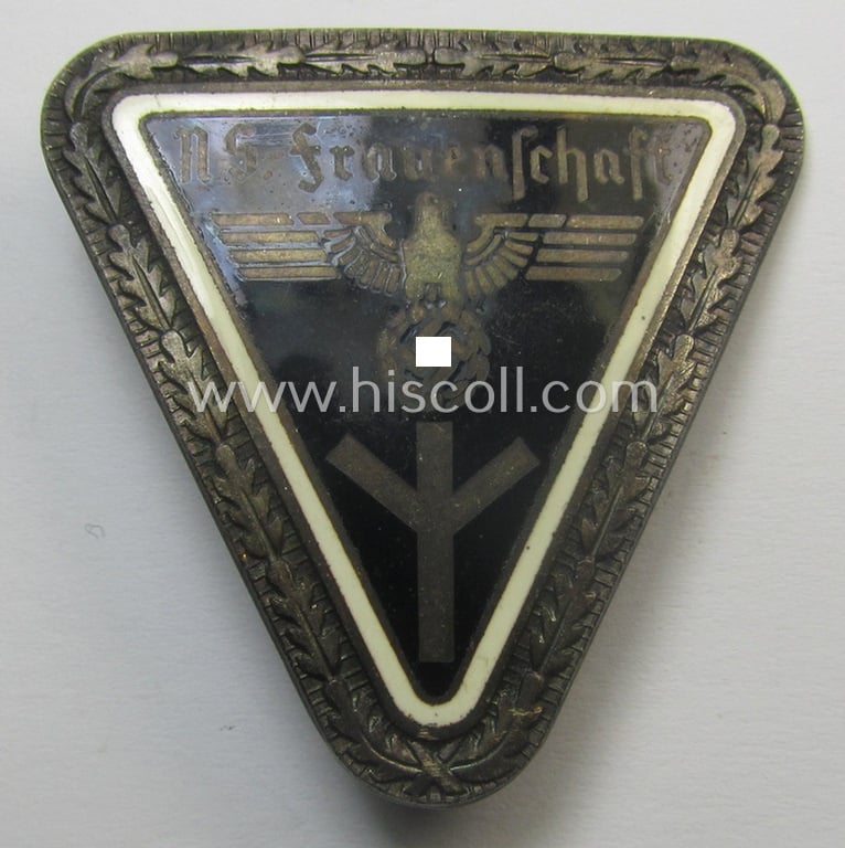 This particular - partly-enamelled and actually very scarcely found! - 'NS-Frauenschaft'- (ie. NSF-) membership-badge (ie. 'Mitgliedsabzeichen') is showing an outer 'oak-leave'-wreath and was as such intended to signify membership within the German Womens'-Association (or in German-language: 'NS-Frauenschaft') and that was specifically intended for usage by a fairly high-ranked NSF-official holding the rank a: 'Frauenschaftsleiterin' at 'Kreis'-level (ie. aka 'Kreisfrauenschaftsleiterin') and that comes in an overall very nice- (and just moderately used- ie. worn-), condition. The example on offer here is one of the regular-sized versions of the series and measures 38 mm. in height (as can be seen on the pictures). The badge comes in an overall very nice and (I deem) only moderately used- ie. worn, condition: the neatly enamelled surface shows some minimal scratches but is totally void of any damage whatsoever (as can be noticed on the pictures). The badge shows a clearly present, superimposed: 'RzM M1/24'-designation on its back: the white-toned enamelled outer 'rim' denotes that the female official who wore this served at: 'Kreis'-level (as can be noticed on the pictures). A similar piece is also figured in the 'Heering-Hüsken'-lapel-pin-catalogue wherein it is given a unique reference-number ('9125NJ') and is given an estimated value of 350 Eu(!). Simply a very attractive - and actually rarely encountered! - 'NS-Frauenschaft-Mitgliedsabzeichen' as was specifically intended for a: 'Kreisfrauenschaftsleiterin' and that is (I deem) with certainty accordingly priced!
