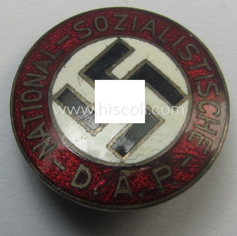 The truly attractive - very desirable and I deem truly early-period and actually very nicely preserved! - somewhat smaller-sized(!), N.S.D.A.P.-membership-lapel-pin (ie. 'N.S.D.A.P.-Parteiabzeichen') has only been moderately used ie. worn but still has a very nicely preserved age-patina and has most certainly never been cleaned nor polished: it is showing just minimal wear but is totally void of any (enamel) damage (as can be seen on the pictures): just some regular wear ie. minimal scratches are noticable. The badge shows, moreover, a somewhat tarnished- (ie. minimally stained-) finish as can be seen from the pictures. This example - which has a somewhat darker-red-coloured- (ie. enamelled) area - comes mounted onto its (typical and of course still functional) pin- ie. pin/catch-set-up (as can be seen on the pictures). The neat 'variant'-piece is as stated above a bit smaller than its regular-sized counterparts and has an approximate diameter of only: 1,8 centimeter (for comparative purposes did I attach a picture wherein this piece is shown next to a regular-sized party-badge). The piece is neatly maker-marked on its back with the designation '6.' and that is as such a piece that was produced by the maker (ie. 'Hersteller') named: 'Karl Hensler' as was based in the town of Pforzheim. Next to this does this specimen show a neat: 'Ges.Gesch.'-patent-pending-designation (on its set-up) as can be noticed on the pictures. I deem this an attractive - and desirable early- ie. 'variant pattern'! - 'N.S.D.A.P.'-membership-pin ie. party-badge that is priced according to its fully untouched and/or very nicely preserved condition!