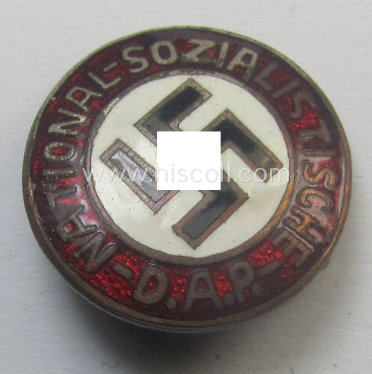 Unusual - smaller-sized- and darker-red-coloured! - 'N.S.D.A.P.'-membership-pin- ie. party-badge (or: 'Parteiabzeichen') being a non-maker-marked example that shows a (double!) 'Ges.Gesch.'-patent-pending-designation