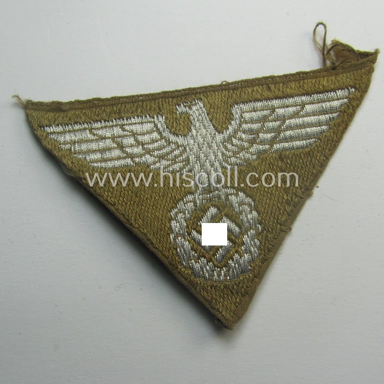 This is an attractive - and actually not that easily encountered! - example of an: N.S.D.A.P.-related cap-eagle as was specifically intended for the: 'Lagermütze' (ie. side-cap) being an example as woven in bright-silver on a golden-brownish-coloured background and that was as such intended for students serving within one of the: 'Ordensburgen' and that comes in an overall very nice- (ie. I deem once cap-attached- ie. neatly pre-folded-), condition. These N.S.D.A.P.-related cap-eagles - which are executed in so-called: 'flat-wire'-type, 'BeVo'-weave-pattern can easily be recognised due to the fact that its eagles'-head is facing left: the similarly shaped 'N.S.D.A.P.-related examples are facing right. There existed four such training-institutes in Germany being respectively the: 'Ordensburg Vogelsang' in Nordrhein-Westfalen, the 'Ordensburg Sonthofen' in Bayern, the 'Ordensburg Krössinsee' and the 'Ordensburg Mariënburg': all four institues were used to educate and train the 'Politischen Leiter' of the 'N.S.D.A.P.'. The piece was (I deem) once cap-attached but will nevertheless be very hard to be upgraded (it is still a bit wrinkled and does show some minimal age as can be seen on the pictures). Simply an attractive - and actually scarcely encountered! - political side-cap-eagle as used by a student within one of the 'Ordensburgen' and that is with certainty accordingly priced!