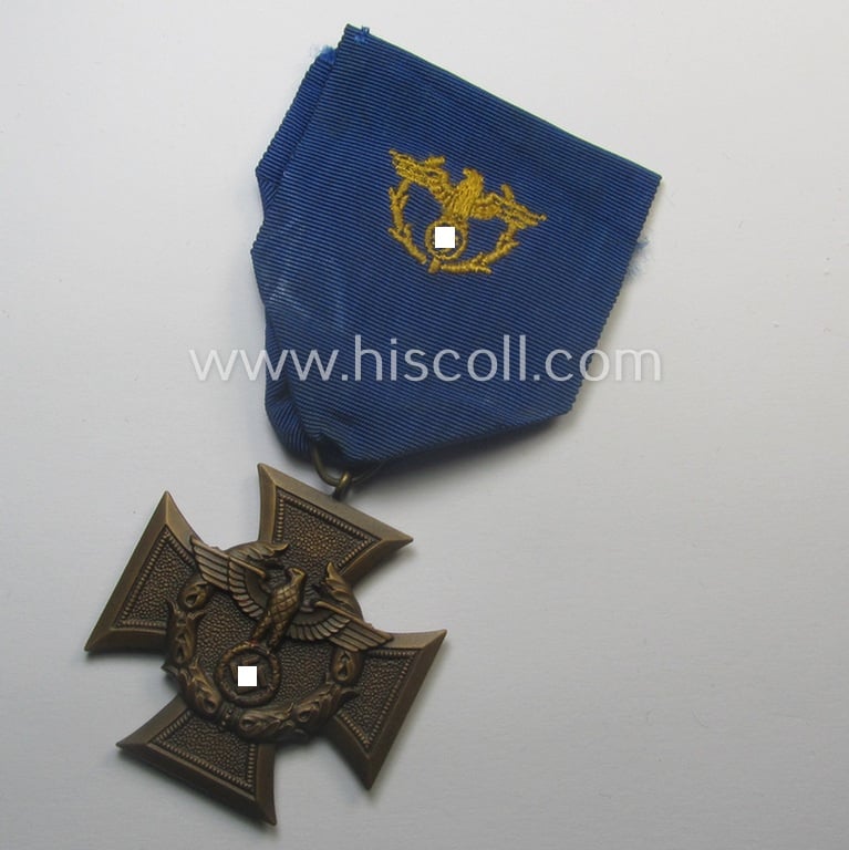 This is truly attractive - and actually scarcely encountered! - example of a typical reddish-bronze-toned- (and/or: typical 'Buntmetall'-based!) so-called: 'Zollgrenzschütz-Ehrenzeichen' (or: customs loyal-service medal) that came period-mounted onto its full-length- (ie. somewhat broader-shaped, minimally confectioned- and actually scarcely found!) ribbon (ie. 'Bandabschnitt') and that comes in an overall very nice- (and I deem issued- albeit never worn- ie. nor once mounted-), condition. The medal is just a tiny bit tarnished but retains a truly fantastic and detailed age-patina overall (it has most certainly never been cleaned nor polished). The award - which was as stated above period-mounted - came onto its original, nicely folded and full-length (ie. approximately 14,5 cms. long and/or: 5,2 cms. wide-sized) cornflower-blue-coloured ribbon that shows an interwoven golden-yellow-coloured 'Zollgrenzschütz'-eagle-device (as can be seen on the pictures). The award originates from a private-household in Germany where it was recently found as such. Simply a very nicely preserved - and truly scarcely found! - 'Zollgrenzschütz-Ehrenzeichen'-medal-set that is - I deem - accordingly priced!