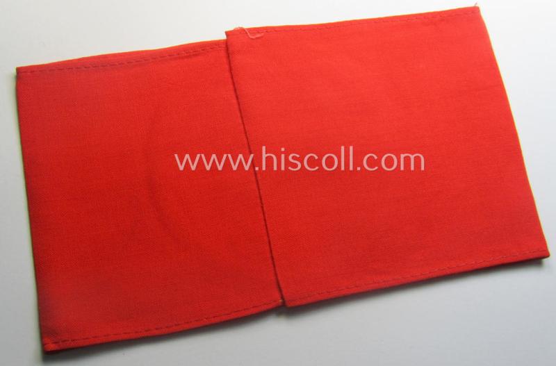 This is a very attractive - and I deem simply never used- nor worn! - example of an (I deem) early-war- (ie. 'pre-war'-) period so-called: N.S.D.A.P.-related party-armband (ie. 'Armbinde') being of the 'non-woven'-pattern showing a white-coloured (linnen-based) roundel that is showing a black-coloured and linnen- ie. braid-based swastika-device and that comes in an overall very nice- (ie. I deem simply never used- nor worn- ie. still 'virtually mint- ie. unissued'-), condition. These linnen-based armbands were 'standard-issue' for usage by the various N.S.D.A.P.-party-members and/or officials (but were also worn by members of various other Third Reich organisations such as for example the members of the N.S.K.K., RAD and/or SA to mention a few) and were worn on the left upper-arm. This example - having a total (folded) size of 37 cms. and is approximately 10,5 cms. wide as more often - is neatly constructed from bright-red-coloured linnen and shows a neat (also linnen-based) 'roundel' that shows a black-coloured- and as stated linnen- (ie. braid-) based swastika (as can be seen on the pictures). This example - that still retains its period-attached: 'RzM'-etiket - is void of an ink-stamp (as is more often seen). The piece - which retains very bright and vivid colours! - is truly nicely constructed and does show obvious storage-age ie. staining simply caused by decades of storage only: it comes 'off-factory' sewn-together (as can be seen on the pictures). Simply a very attractive N.S.D.A.P.-related item that will be impossible to be upgraded and that is with certainty accordingly priced!