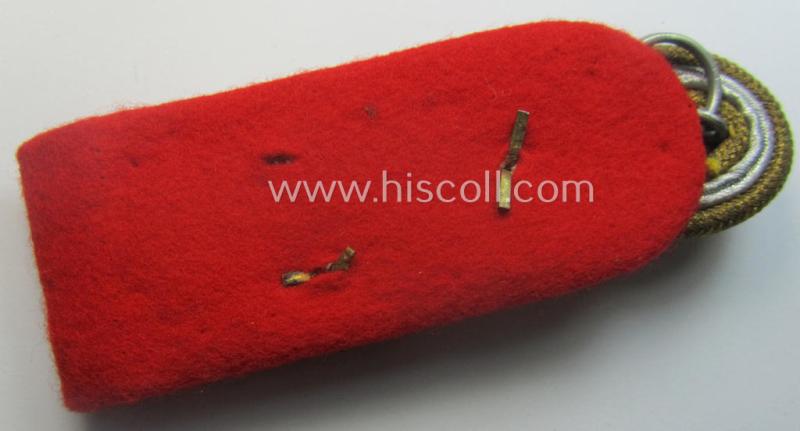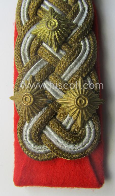 This is a truly very attractive - albeit regrettably single! - WH (Heeres), general-officers'-pattern shoulderboard (ie. 'Schulterstück für Generale des Heeres') as was specifically intended for (a high-ranked!) army general-officer having the rank of a: 'Generaloberst' and that comes in an overall very nice- (I deem clearly issued-, worn- and/or carefully tunic-removed-), condition. The neat board - which is executed in typical, twisted, golden- (ie. silver-) toned 'braid' - has the bright-red-coloured- and truly smooth-woolen- (ie. 'moleskin'-) based 'underlay' (as can be seen on the pictures). The board - that measures approximately 11 cms. in length - shows truly extraordinary detail and is by all means a great example of the employed craftmenship of the days. The board comes with a golden-toned tunic-button attached and never had a tongue attached: it is just a tiny bit tarnished- ie. stained (simply caused by years of storage and/or moderate wear). It does show three (golden-toned, somewhat smaller-sized and/or Buntmetall-based) pips period-attached denoting the (unusual and high!) rank of a: 'Generaloberst'. It belonged to a (regrettably unknown!) army 'General' who kept and/or stored this neat insignia-piece for decades. Simply a very attractive and/or truly detailed WH (Heeres) general-officers'-type shoulderboard in an unusually encountered rank that is priced according to its unmistaken rarity and/or desirability: too bad that it is only a single specimen!
