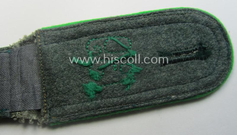 This is a very attractive - albeit regrettably single but nevertheless rarely found! - WH (Heeres) early- (ie. pre-) war-period, so-called: 'M36- o. M40'-pattern- (rounded-styled) neatly 'cyphered'- and/or darker-green- (ie. grüner-) piped, NCO-type shoulderstrap (as executed in early-styled so-called: 'Reichswehr'-period linnen!) as was intended for - and clearly worn by! - an: 'Unteroffizier des Gebirgsjäger-Regiments 139' (or: NCO and junior-sergeant who served within the army mountain-troops-regiment, numbered: '139') and that comes in an overall nice- (albeit moderately used ie. worn-), condition. The somewhat broader-shaped shoulderstrap - which measures approximately 11 cms. sized in length - does show the greenish-coloured- and/or linnen-based (ie. HBT-styled) 'upperdeck' and has the woolen-type piping attached. Moreover, does it show the neatly machine-embroidered and also darker-green-toned: '1'-, '3'- and/or '9'-cyphers ie. numerals (or: 'Ziffern') (which are excuted in so-called: 'Kurbelstickerei' as can be seen on the pictures). The strap - which came mounted onto its functional tongue - shows as stated above some moderate usage and/or wear (some minor staining and/or dust is visible and/or present). It should be noted that all 'cyphered'-pattern, WH (Heeres) 'Gebirgjäger'-related shoulderstraps can easily be regarded 'fairly scarce'. This strap originates from an older 'Gebirgjäger'-related shoulderstrap ie. board-collection that I recently acquired for the web-site. Simply a very attractive and/or: early-war-period, neatly 'cyphered' and/or 'Heeres'-related NCO-type shoulderstrap that was intended for usage by an: 'Unteroffizier des Gebirgsjäger-Rgts. 139' (part of the: '3. Gebirgs-Division')!