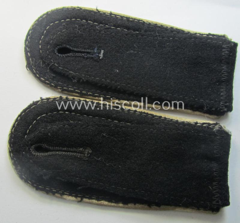 This is a very attractive - truly very desirable, fully matching and nowadays scarcely found! - pair of Waffen-SS, NCO-type shoulderstraps (ie. 'Schulterstücke für Unterführer der Waffen-SS') as piped in the white-coloured branchcolour as was specifically intended for usage by an: 'SS-Unterscharführer' (ie. junior-sergeant) who served within the: 'Waffen-SS Infanterie-Truppen' and that comes in an overall very nice- (albeit moderately used- ie. worn-), condition. The shoulderstraps are constructed from the typical, (smooth-type) black-coloured-wool and show the black-coloured 'upperdecks': the straps show in all facets a 'standard-issued- and (I deem) mid- (ie. later-) war-pattern-type pair. The shoulderstraps - which measure approximately 11 cms. sized in length each as more often encountered - show the neat white- (ie. 'weisser'-) coloured branchcolour and/or desirable 'silk-like'-type branchcolour ie. piping attached (as can be seen on the pictures). The straps - which are also 'backed' with black-coloured wool as more often - come of course mounted onto their regular-sized tongues, attached. The straps are totally void of any damage but does show some obvious wear, age and/or staining (as can be seen on the pictures). It should be noted that almost every collector is looking for these white-piped, Waffen-SS NCO-type-shoulderstraps but these are very hard to find and nowadays hardly ever offered for sale. The straps are as stated above only moderately used ie. worn. It should be noted that these original, period Waffen-SS NCO-type-shoulderstraps can easily be graded 'very scarce': even more so, when they are piped in the rarely encountered, white-coloured- (ie. 'SS-Infanterie-Truppen'-related-) branchcolour!