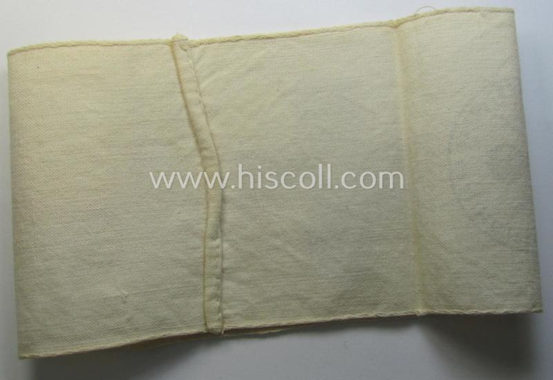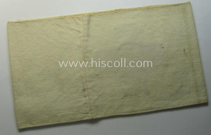 This is an attractive example of a (typical) linnen-based- and/or neatly 'machine-embroidered' WH (Heeres) related, beige-white-coloured DRK- (ie. 'Deutsches Rotes Kreuz'-) armband (ie. 'Armbinde') as was intended for usage by the various (military) staff-members of the: 'Deutsches Rotes Kreuz' (or: German Red Cross) and that comes in an overall very nice- (ie. clearly issued- and I deem just moderately used- ie. worn-), condition. These neat beige-white-coloured and/or: linnen-based armbands showing the (interwoven) red cross were used by the various (army) staff-members serving as medical orderly. The armband on offer here comes in a full-length condition and measures approximately 37 x 10,5 cms.: it is executed on somewhat 'course-like' linnen (as can be seen on the pictures). The piece shows some minimal staining ie. dust simply caused by decades of storage and/or moderate wear. This example shows a larger-sized (black-coloured) ink-stamp (ie. 'Dienstsiegel') that reads: 'Kommissar der freiwilligen Krankenpflege' (as can be seen on the pictures). Nevertheless, an attractive example of a WH (Heeres) related 'Deutsches Rotes Kreuz'-armband that is with certainty accordingly priced!