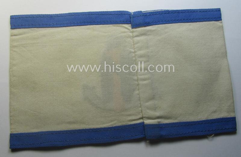 This is a truly very attractive - and with certainty rarely encountered! - WH (Kriegsmarine) armband (or: 'Dienstarmbinde') as was (I deem) specifically intended for (graduated!) staff-members ie. students or cadets serving within one of the naval officers'-cadet-schools and that comes in an overall very nice- (ie. I deem never used- ie. 'virtually mint- ie. unissued'-) condition. The neat armband - which was 'off-factory' sewn-together measures folded approximately 37 x 11 cms. in length - shows the typical, WH (Kriegsmarine) anchor-device as woven in black- (ie. golden-yellow-) coloured linnen on a white- ie. somewhat beige-coloured and/or linnen-based background. The piece - which has I deem simply never been used nor worn - shows some minimal storage-age and/or staining - and shows the (typically additionally added) light-blue-coloured borders. I am personally quite convinced that these naval armbands were worn by students serving within one of the naval officers'-cadet-schools, however, another reference-book mentions that these armbands were intended for soldiers having: 'Havariedienst' (I deem some sort of harbour-service). In any case is this a very nice - and with certainty rarely seen! - Kriegsmarine-related 'Armbinde' that is priced according to its desirability and/or unmistaken rarity!