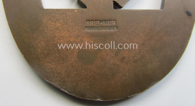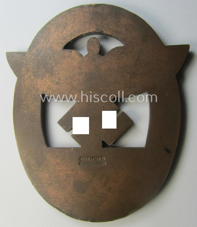This is a very attractive - and actually quite rarely found! - oval-shaped- and (I deem) neatly 'Cupal'-based! - so-called: N.S.F.K.- (ie. (or: 'National Socialistisches Flieger Korps'-) related non-portable plaque (ie. 'Erinnerungs- o. nichttragbare Plakette') being a neatly maker- (ie. 'Brehmer - Marneukirchen'-) marked example as was issued to commemorate a specific N.S.F.K.-meeting ie. national rally entitled: 'N.S.F.K. Ostlandflug - 20.u.21.5.39 - NS-Fliegerkorps' and that comes in an overall very nice- (albeit surely issued ie. I deem just moderately used-), condition. The very detailed and/or pronounced badge - which is executed in somewhat tarnished, reddish-copper-coloured and - I deem - 'Cupal'-based metal and that measures approximately 9,4 x 7,8 cms. - truly shows extraordinary detail and was almost certainly never cleaned nor polished. The piece - which shows as stated above a clear makers'-designation on its back (that reads: 'Brehmer - Marneukirchen') shows the: N.S.F.K.-logo (ie. 'fliegender Mensch') surrounded by the text as mentioned above (as can be seen on the pictures). Simply a very attractive - and truly seldomly seen! - N.S.F.K.- (or: 'National Socialistisches Flieger Korps'-) related 'Erinnerungs- o. nichttragbare Plakette' that is accordinly priced!