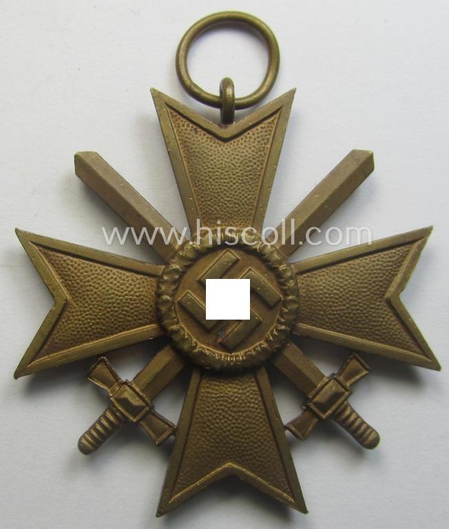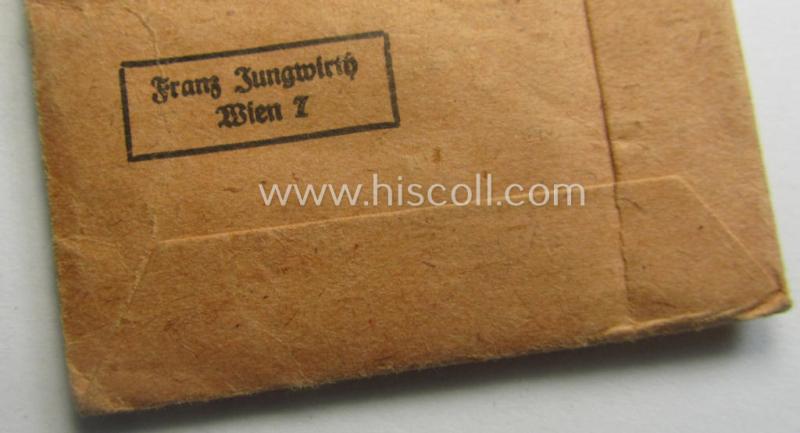 This is an attractive - and fully matching! - medal-set: 'Kriegsverdienstkreuz 2. Klasse mit Schwertern' (or: War Merits' Cross second class with swords) comprising of a non-maker-marked (and/or neatly 'Buntmetall'-based!) specimen that comes packed in its original pouch of issue as was produced by the (unusually found!) Austrian maker- (ie. 'Hersteller') named: 'Franz Jungwirth' as was based in the town of Wien (Vienna) and that comes in an overall very nice- (ie. I deem issued but simply hardly worn- nor used-), condition. The medal came together with its original, minimally confectioned, bright-red-coloured and pre-folded (and approx. 19 cms. long-sized) ribbon and came packed in its neat (regular-sized 'Zellstoff'-based) pouch (which is fully complete but that shows some minor age as can be seen on the pictures). The medal - which is a very nicely preserved 'Buntmetall'-based specimen - was I deem issued but simply hardly used nor worn. The medal has a quite 'shiny' (ie. golden-bronze) coloured age-patina and was most certainly never cleaned nor polished and therefore are details and/or finish still very nice and/or crisp. The pouch comes as stated above in an equally nicely preserved condition: it shows the printed makers'-designation of the 'Franz Jungwirth'-company (as is printed on its back as stated above). It should be noted that the 'Kriegsverdienstkreuz 2. Klasse mite Schwertern'-award is quite commonly encountered: those matching sets are most certainly NOT! Simply one of the nicest, and fully matching 'KvK II.Kl. mit Schwertern'-medal-sets by this particular maker I had on offer for quite some time!
