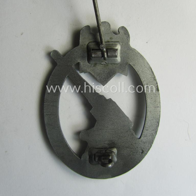 This is a very attractive - and actually quite rarely encountered! - example of a so-called: 'Heeres-Flakkampf-Abzeichen' (or: army anti-aircraft war-badge) being a non-maker-marked- and/or zinc- (ie. 'Feinzink'-) based specimen of the so-called: 'pillow-crimped'-pattern as was produced by a to date unidentified maker and that comes in an overall very nice- (ie. I deem hardly used- nor worn-), condition. The badge on offer here concerns a later-war-period, typical zinc- ie. 'Feinzink'-based specimen that retains most (ie. all!) of its (fairly shiny!) silver-coloured finish and has maintained an attractive appearance, still showing pronounced detail as to be expected. The badge is truly converse-shaped and has never been cleaned nor polished (and is still also a tiny bit dirty ie. stained- ie. tarnished as mentioned above). As stated above, does it deal with a so-called: 'pillow-crimped'-pattern that naturally shows all the details as to be expected for a badge by this particular maker. Simply a very attractive and honest 'Heeres-Flakkampf-Abzeichen' of the so-called: 'pillow-crimped'-pattern that comes in an overall very nice condition: it will be very hard to upgrade this specimen!