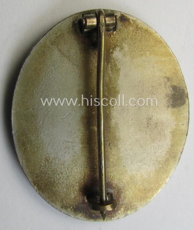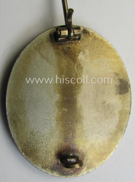 The truly attractive - and fairly luxuriously styled! - silver-class wound-badge (or: 'Verwundeten-Abzeichen in Silber') is executed in neat and/or minimally shiny (ie. somewhat tarnished), so-called: 'Buntmetall' and does show some obvious usage and/or wear (as can be seen on the pictures). The badge - which is naturally non-magnetic - comes mounted onto its fully functional (thin-shaped- and totally unaltered) pin (which is of course fully functional) and comes mounted onto its functional and dito pristine catch (as can be seen on the pictures). The badge is most certainly never cleaned and retains truly most of its silver-toned finish. It is - as stated above - a non-marked example that is I deem an early-period- (and truly quality-procuded!) piece that was produced by a (by me) unidentified maker. Simply an attractive - and with certainty desirable! - early-war-period, silver-class WB that is priced according to its overall nice- and/or untouched, condition!