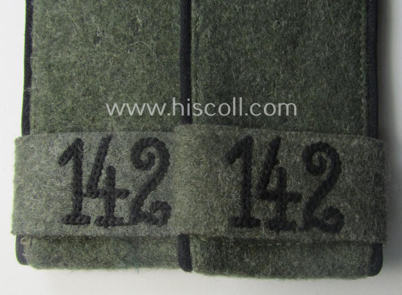 This is an attractive - fully matching and with certainty scarcely found! - pair of early- (ie. mid-) war-period, WH (Heeres) enlisted-mens'-type (ie. 'M40'- ie. 'M43'-pattern) and neatly 'cyphered' shoulderstraps (ie. having a neat and matching pair of 'Schulterstück-Überschuben' attached!) as piped in the black- (ie. 'schwarzer'-) coloured branchcolour as was specifically intended for - and clearly used by! - a simple soldier (ie. 'Soldat') who served within the: 'Pionier-Batallions 142' (or: army-engineers'-construction-unit ie. bataillon, numbered: '142') and that comes in an overall very nice- (albeit moderately used ie. worn- and/or most certainly once tunic-attached-), condition. The straps are just moderately worn and do show some minimal wear, age and/or staining but are void of any damage or alike (as can be seen on the pictures). The straps show the desirable black- (ie. 'schwarzer'-) coloured- and/or 'silk-like'-type piping attached and measure approximately 11,5 cms. in length each. The pieces came mounted onto their period tongues attached (as can be seen on the pictures). The pair is constructed from the typical field-grey-coloured wool and is with certainty a 'standard-issued'-pair. Of additional interest is, moreover, the fact that this pair came with a (matching) pair of (field-grey-coloured- and/or woolen-based) so-called: shoulderstrap-slip-ons (ie. 'Schulterstück-Überschuben') period-attached bearing both the unit-designation: '142' (as executed in equally black-coloured, so-called: 'Kurbelstickerei' done in wool as can be seen on the pictures). This particular pair originated from a larger cloth- ie. 'cyphered'-shoulderstrap-collection I recently acquired for the web-site. Simply an attractive - and with certainty desirable! - neatly 'cyphered', 'Pioniere'-related EM-type shoulderstrap-pair that belonged to a: 'Soldat u. Mitglied des Pionier-Batallions 142'; I deem that I priced this attractive - and most certainly desirable! - EM-type pair according to its overall nicely preserved condition!