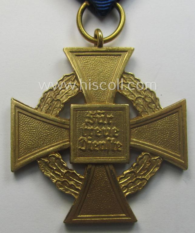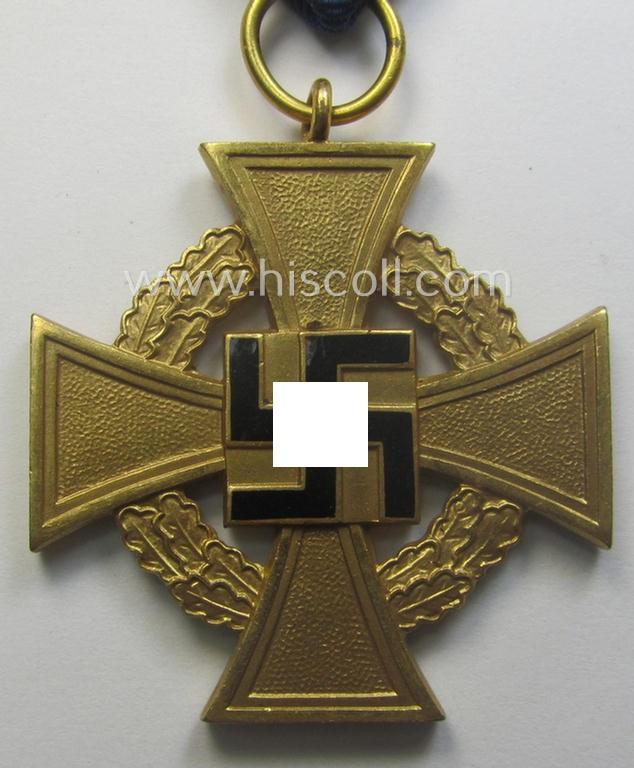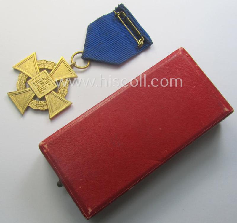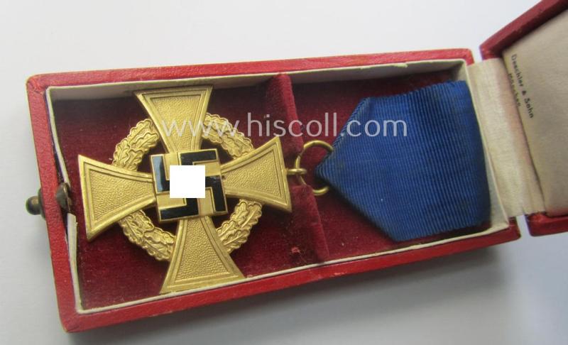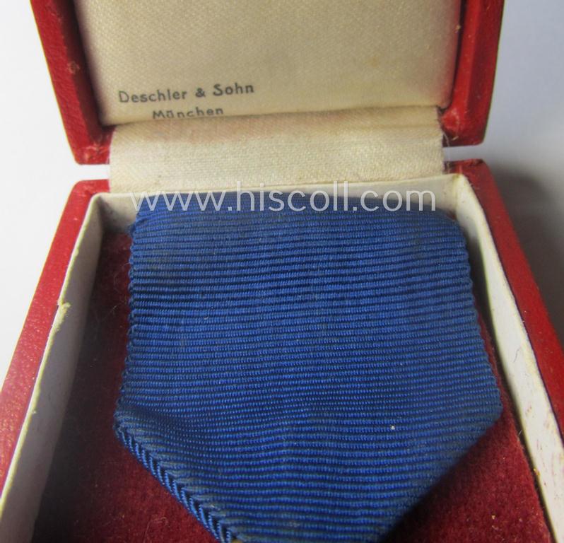 This is an attractive - and I deem just minimally used ie. worn - example of a so-called: 'Treuedienst Ehrenzeichen 1. Klasse' (or: golden-class, loyal-service-medal for 40 yrs. of loyal civil-service) being a (typical) non-maker-marked example that comes mounted onto its original ribbon (ie. 'Bandabschnitt') and that comes stored in its neatly maker- (ie. 'Deschler & Sohn - München') marked etui as issued and/or recently found. The medal is a truly attractive piece that truly retains all of its period, bright-golden-coloured- and/or fairly 'frosted' finish: it also retains most (ie. all!) of its 'off-factory applied': 'hochpolierte Kanten' (or: polished sides) but is just a tiny bit stained (it has never been cleaned). It comes mounted onto its cornflower-blue-coloured ribbon which still has its period (golden-toned) attachment-pin in place as was intended for wearing the medal on a tunic. The medal has never been cleaned and has an immaculate (ie. fully undamaged!) enamelled swastika(area). The medal came stored in its original, bright-red-coloured etui (as can be seen on the pictures). This etui is fully undamaged but does just show some minimal (handling ie. storage-) age and/or minimal staining (as can be seen on the pictures). Simply a very attractive example of an: 'Treuedienst Ehrenzeichen 1. Klasse' that will be hard to be upgraded!