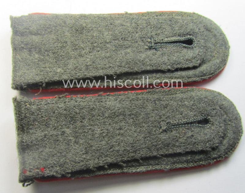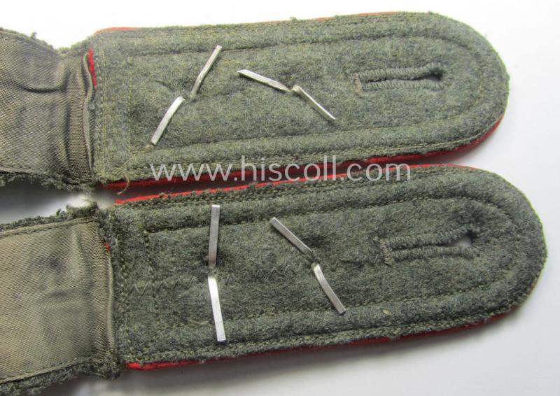 This is a truly very attractive - and I deem just minimally used and/or fully matching! - pair of typical 'standard-issued'- (ie. non-'tailor-made'-) pattern, WH (Heeres) early- (ie. mid-) war period- (ie. 'M41'- ie. 'M43'-pattern) NCO-type shoulderstraps (ie. 'Schulterklappen für Unteroffiziere des Heeres') as was piped in the desirable bright-red- (ie. 'hochroter'-) coloured branchcolour as was specifically intended for usage by an: 'Oberachtmeister o. Oberfeldwebel eines (Sturm)Artillerie-Abteilungs o. Regiments' (or: senior-NCO and sergeant first-class who served within an artillery unit or regiment) and that comes in an overall very nice- (ie. I deem just minimally used- ie. worn-), condition. The neat straps - which have the 'standard'-pattern, field-grey-coloured and/or typical woolen-based 'upperdecks' and that measure approximately 12 cms. in length each - show the neat bright-red- (ie. 'hochroter'-) coloured and/or desirable 'silk-like'-type piping attached (as can be seen on the pictures). The straps - that show the typical bluish-grey-toned (ie. truly sub-dued) NCO-braid and two pairs of (regular-sized, aluminium-based) pips period-attached - come naturally mounted onto their period (regular-shaped) tongues attached and come both in a very nice- (ie. fully 'text-book') condition overall (as can be seen on the pictures). The pair only shows minimal wear and/or age and is just very nicely preserved (as can be seen on the pictures). I deem this an excellent occasion to acquire a neat senior-NCO-type, non-privately-purchased '(Sturm)Artillerie'-related shoulderstrap-pair for a justified price: one of the nicest such pairs I had on offer for quite some time!