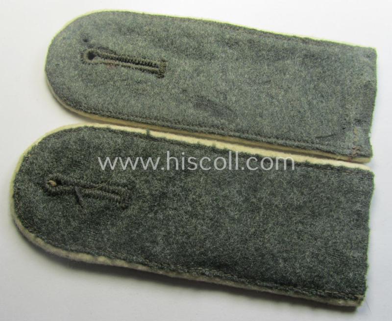 This is an attractive - fully matching and actually scarcely found! - pair of WH (Heeres), early-war-period (ie. 'M40'-pattern, rounded-styled- and/or neatly 'cyphered') enlisted-mens'-type shoulderstraps having the white- (ie. 'weisser'-) coloured branchcolour as was intended for usage by a: 'Soldat des Infanterie-Regiments 19' (or: simple soldier who served within the army-infantry-regiment, numbered: '19') and that comes in overall very nice- (albeit just moderately used- and/or worn-), condition. The neat straps - which are both approximately 12 cms. sized in length - have the 'standard-pattern' and/or: dark-green-coloured- and woolen-based 'upperdecks' and have as stated above the white (ie. 'weisser'-) coloured and woolen-type piping attached (as can be seen on the pictures). The shoulderstraps show the neat, white- (ie. 'weisser'-) coloured and/or neatly machine-embroidered: '1'- and/or: '9'-numerals ie. 'Ziffern' (which are executed in so-called: 'Kurbelstickerei' as to be expected). The pair never had any tongues attached and was clearly intended (as used as!) a pair of the 'sew-in'-pattern: the pair does show some minimal age-, wear and/or staining but is totally void of any damage or alike (as can be seen on the pictures). Simply a neat - and I deem quite early war-period - 'Heeres' EM-type, shoulderstrap-pair that belonged to a: 'Soldat des Infanterie-Regiments 19': I deem that I have priced this attractive - and with certainty desirable! - 'Infanterie'-pair, accordingly!