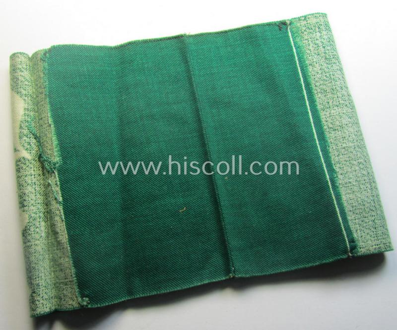 This is an attractive - and with certainty rarely seen! - example of a (typical) darker-green-coloured, so-called: 'N.S.D.A.P.'- (ie. 'Luftschutz'-) related armband (ie. 'Armbinde') being of the 'entirely printed'-type showing the text: 'Luftschutz NSDAP' and that comes in an overall very nice- (ie. clearly issued- and/or most certainly worn ie. used-), condition. These linnen-based armbands were presumably intended for usage by the various 'N.S.D.A.P.'-members and/or officials that were tasked as 'Luftschutz'-staff during for example political gatherings and/or events and were worn on the left upper-arm. This example - having a total size of approximately 35 cms. and that is 12,5 cms. wide as more often - is constructed from (typical) darker-green-coloured linnen and shows the text as mentioned above. This example was 'off-factory' stitched-together and shows a hard-to-read (but most certainly!) present, red-toned ink-stamp (as can be seen on the pictures). Simply a very attractive - and with certainty rarely seen! - 'N.S.D.A.P.'- ie. 'Luftschutz'-related armband that is priced according to its comparative rarity and/or desirability!