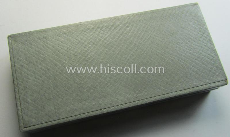 The very attractive medal - which is a typical non-maker-marked specimen as executed in light-weight (ie. aluminium-based- and quite shiny) metal as more often encountered - comes mounted onto its (minimally confectioned, neatly pre-folded- ie. full-sized) ribbon (ie. 'Bandabschnitt') and comes in an overall very nice- (ie. I deem simply never worn- nor used- ie. 'still virtually mint'- ), condition. The award is (I deem) never used nor worn (it only shows some minimal dust simply caused by years of storage only) but retains stunning detail (and was most certainly never cleaned nor polished). The greyish-blue- (ie. dove-grey) coloured etui (which is truly scarce in itself!) - comes in an equally very nicely preserved condition and is naturally fully functional: it shows no damage whatsoever but does show some minimal staining ie. usage- (ie. storage-) marks only. The etui naturally retains a fully present, black-coloured, imprinted text on its top (as can be seen on the pictures). Simply an attractive, non-maker-marked 'Luftschutz-Ehrenzeichen 2. Stufe'-medal-set that will be very hard to be upgraded and that is accordingly priced: maybe the best such complete set I ever had on offer!