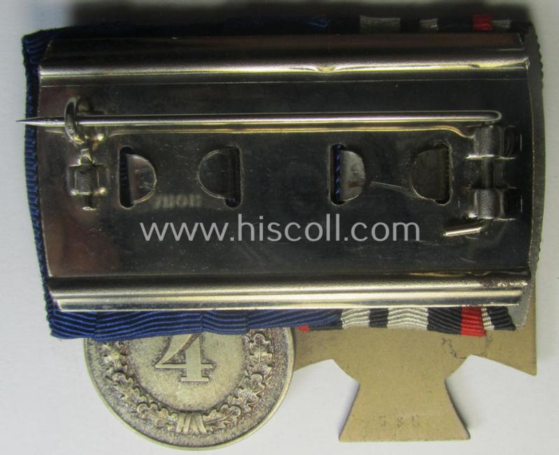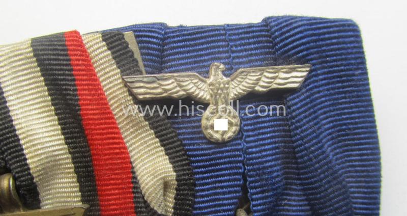 This is an attractive - and in this uncommonly found combination not that often seen! - two-pieced (and typical non-detachable) medal-bar (ie. 'Doppelspange') respectively depicting a WWI-period: 'Frontkämpferkreuz 1914-18' (ie.: 'Kriegsteilnehmerkreuz ohne Schwertern') and a neatly silvered: WH (Heeres o. Kriegsmarine) Dienstauszeichnung für 4 Jahre Treue Dienste' (or: army- ie. naval loyal-service medal for four years of loyal service) that comes with a detailed, silver-coloured eagle-device firmly attached both pieces coming in an overall nice- (albeit minimally used- ie. worn-), condition. Both awards are truly bronze- (ie. darkened golden) and/or silver-coloured and 'fairly frosted' examples that are just minimally tarnished by age and/or moderate usage and wear (as can be seen on the pictures) but are both void of any damage or alike. Both pieces come naturally mounted on their period ribbons and have a nicely preserved age-patina and are just a tiny bit dirty: they were (I deem) never cleaned nor polished (as can be seen on the pictures). The entire 'Spange' is not 'backed' with a piece of wool but comes mounted onto a chromed-steel-based 'backing-plate' that shows a (regular-type- and functional) pin- ie. catch-set-up (as can be seen on the pictures). The 'Frontkämpferkreuz 1914-18' is a clearly maker- (ie. 'G.&S.'-) marked example (as can be noticed on the pictures). Simply an attractive example of a two-pieced WW1- (ie. TR-) related 'Ordenspange' in an uncommonly found combination that is I deem accordingly priced!