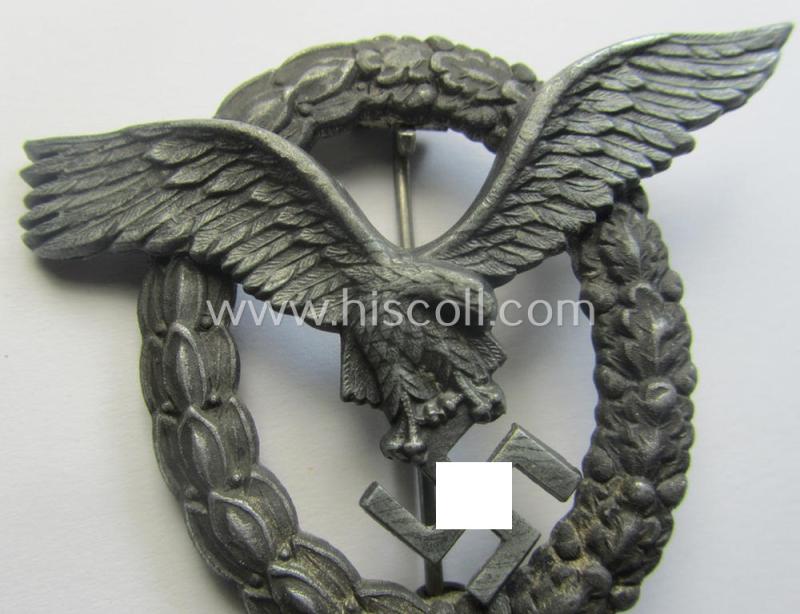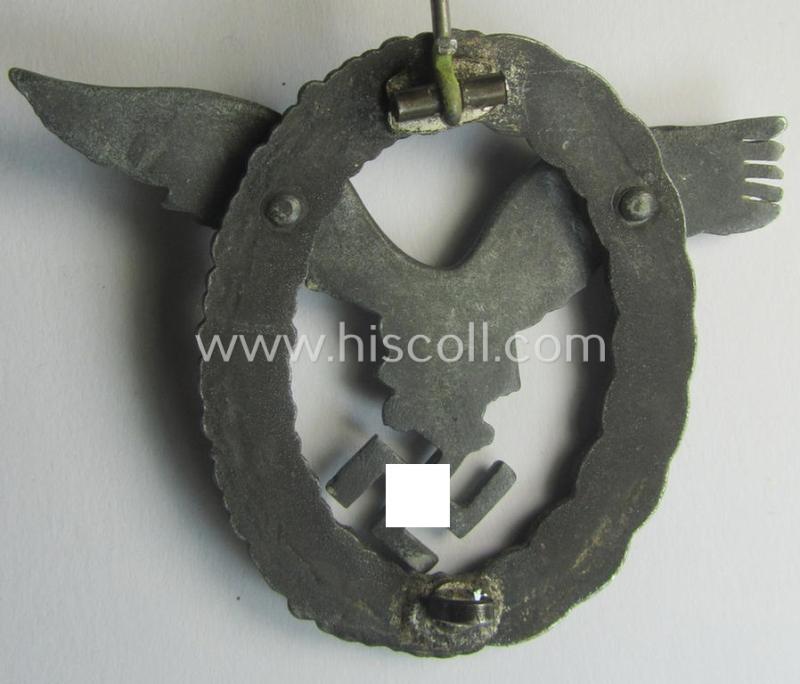 Later-war-period WH (Luftwaffe) 'Flugzeugführer-Abzeichen' (or: pilots'-badge) being a typical zinc- (ie. 'Feinzink'-) based and/or non-maker-marked example by the: 'Friedrich Linden'- (ie. 'FLL'-) company