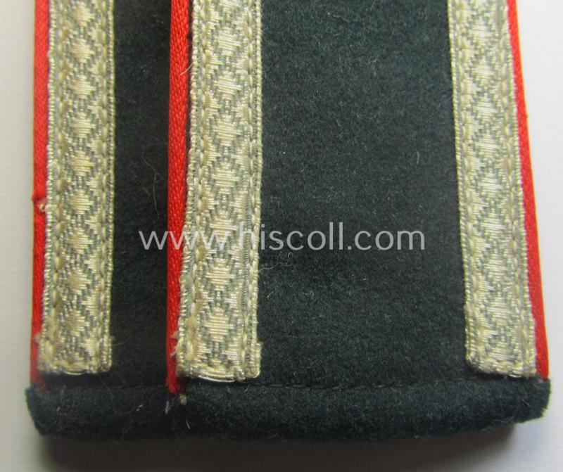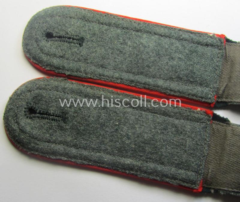 This is an attractive - just minimally used and/or fully matching! - pair of 'standard-issued'- (ie. non-privately-purchased nor 'tailor-made'-) pattern, WH (Heeres) early-war period- (ie. 'M40'-pattern and/or: rounded-styled) NCO-type shoulderstraps (ie. 'Schulterstücke für Unteroffiziere des Heeres') as was piped in the desirable bright-red- (ie. 'hochroter'-) coloured branchcolour as was specifically intended for usage by an: 'Unterwachtmeister eines (Sturm)Artillerie-Abteilungs o. Regiments' (or: junior-sergeant who served within an artillery unit or regiment) and that comes in an overall very nice- (ie. just minimally used- ie. worn-), condition. The neat straps - which have the 'standard'-pattern, darker-green-coloured- and/or typical 'smooth woolen'-based 'upperdecks' and that measure approximately 12,3 cms. in length each - show the neat bright-red- (ie. 'hochroter'-) coloured and/or desirable, 'silk-like'-type piping attached (as can be seen on the pictures). The straps - that show the typical silverish-toned NCO-braid attached denoting the NCOs-rank of an: 'Unterwachtmeister o. Unteroffizier' - come mounted onto their period tongues and come both in an overall very nice- and/or just minimally used condition (as can be seen on the pictures). Simply an excellent occasion to acquire a neat NCO-type, '(Sturm)Artillerie'-related shoulderstrap-pair for an I deem justified price!