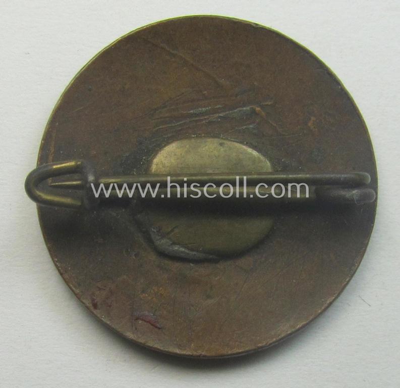 The attractive - actually scarcely encountered and truly nicely preserved! - (I deem) truly early-period(!) N.S.D.A.P.-membership-lapel-pin (ie. 'N.S.D.A.P.-Parteiabzeichen') - which has been just moderately used ie. worn - has a very nicely preserved age-patina and has most certainly never been cleaned nor polished: it is showing just minimal wear but is void of any (enamel)damage (as can be seen on the pictures): just some regular wear ie. minimal scratches are noticable. The - I deem truly early-period! - party-badge is totally void of an 'RzM'-designation nor: 'Ges.Gesch.'-patent-pending-designation (as can be noticed on the pictures). It shows, moreover, a somewhat tarnished- (ie. minimally stained) finish as can be seen from the pictures. This example - which has a somewhat darker-red-coloured- (ie. enamelled) area - comes mounted onto its regular-styled pin- ie. pin/catch-set-up which is naturally still fully functional and/or present (as can be seen on the pictures). I deem this an attractive (and early-period!) 'N.S.D.A.P.'-membership-pin ie. party-badge that is most certainly priced according to its obvious scarcity and/or desirability!