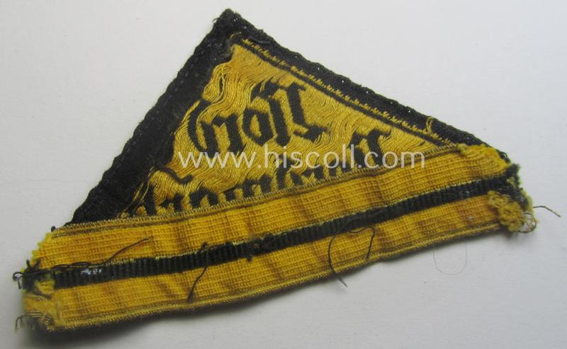 This is a truly early-period(!), 'male'-specimen indicating that it is neatly woven in (somewhat faded) golden-yellow-coloured linnen onto a black-coloured (and also linnen-based-) background. This example was most certainly issued and/or worn and comes (I deem) in a once tunic- (ie. shirt-) attached condition: it comes in an overall nice condition but regrettably misses its paper-based 'RzM-etiket' (as can be seen on the pictures). The piece - which is a specific 'honorary'-example having a (bright)golden-toned and/or typical braid-based 'honorary rank-stripe' period-attached and thus signifying HJ-membership before 1933 - is (I deem) of a truly early-production something that can be corroborated by the somewhat differently-styled Gothic-styled letter-type. It is somewhat faded by usage and shows some minimal staining caused by decades of storage and moderate wear (as can be seen on the pictures). Still an attractive, early-pattern and male-type 'HJ' ('Hitlerjugend') 'honorary'-district-triangle that is most certainly accordingly priced!