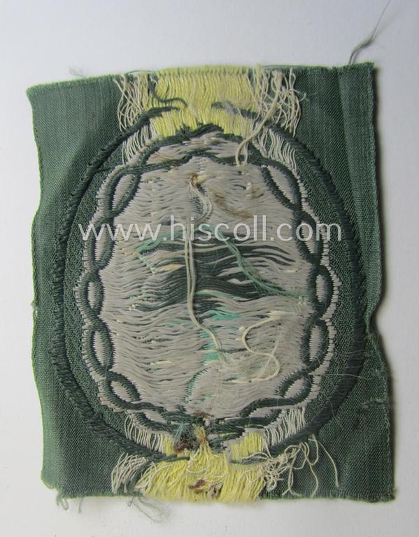 This is an attractive - fairly scarcely encountered 'variant'- ie. first-pattern! - WH (Heeres) 'Gebirgsjäger'- (ie. mountain-troopers-) related arm-badge, being a desirable example as was executed in the 'BeVo'-weave pattern on a typical field-grey- (NOT darker-green!) coloured background and that comes in an overall very nice- (ie. never used- ie. 'virtually mint'-) condition. The piece is neatly machine-embroidered in the so-called: 'BeVo'-weave-pattern on a field-grey-coloured (and/or linnen-based) background and is showing the famous 'Edelweiss' flower. The piece shows some minimal age and/or staining simply caused by decades of storage only: it came as 'straightly cut-of the role'. Simply a nice occasion to acquire a genuine, early- ie. 'first-pattern'- so-called 'Gebirgsjäger' (mountain-troopers) arm-badge for an interesting price!