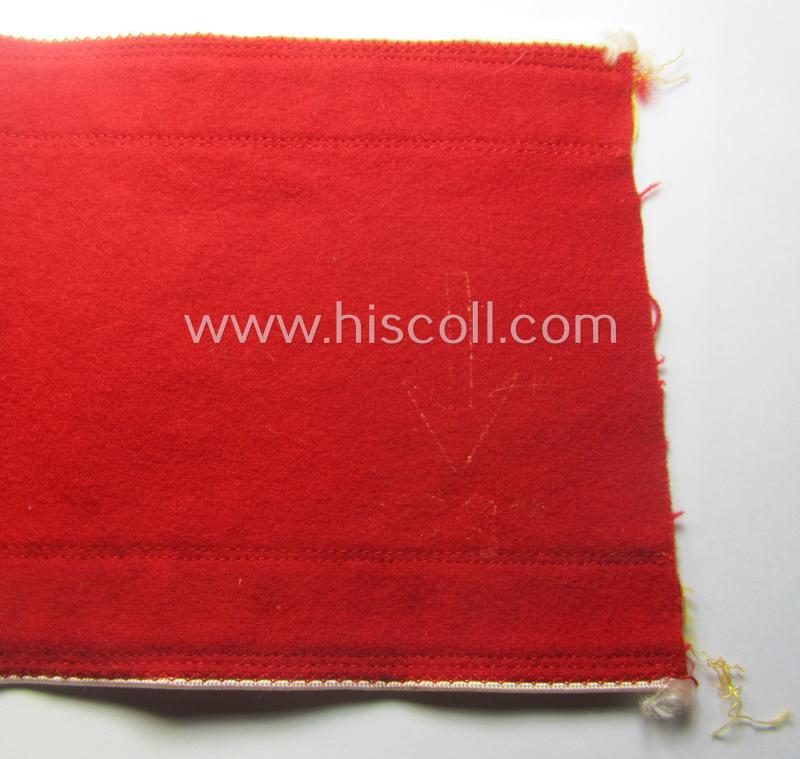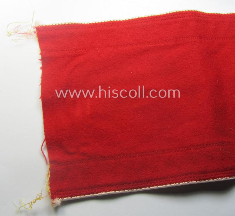 This is a truly very attractive - and with certainty rarely encountered! - N.S.D.A.P.-type, smooth-woolen-based armband (ie. 'Armbinde für politischen Leiter') as was specifically intended for usage by an: 'N.S.D.A.P. Kreisleiter eines Hauptamtes' and that comes in an overall very nice- (ie. I deem simply never used- ie. still 'virtually mint'-), condition. The neat piece - which is constructed from the darker-red-coloured- and/or typical 'smooth-type'- (ie. moleskin-type) wool as to be expected - comes in a wonderful condition overall: it was presumably never used nor even stitched-together and measures approximately 52,5 x 13 cms. The armband is piped with white-coloured- and/or typical rayon-based piping, signifying that the piece was intended usage by a party-official who served at: 'Kreis'-level. The piece is void of an: 'RzM'-etiket (something that is not uncommon) but does show a (white-coloured) ink-stamp showing an upward-postitioned arrow with above the wording 'Oben' (as can be seen on the pictures). The armband shows some minimal tarnish and/or aging, simply caused by having been stored as such for decades. In any case is this a neat and with certainty usually encountered, fairly high-ranked 'N.S.D.A.P.-Armbinde für politische Leiter' that is not that often offered for sale. Only the third such attractive N.S.D.A.P.-related item in this particular rank ie. function I ever had on offer!